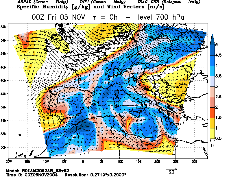 También a las 00:00 UTC del día 5, el análisis ofrece en la topografía absoluta de 700 hPa valores de mas de 4,5 g/kg de humedad específica arrastrados por vientos del sureste hasta La Mancha. Alta humedad y depresión en altura con embolsamiento de aire frío, entre otros ingredientes, la conjunción ideal para poder observar marcada inestabilidad, como así ocurrió. Es un hecho poco frecuente en el interior de la Península Ibérica constatar actividad convectiva de estas características tan avanzado el otoño.