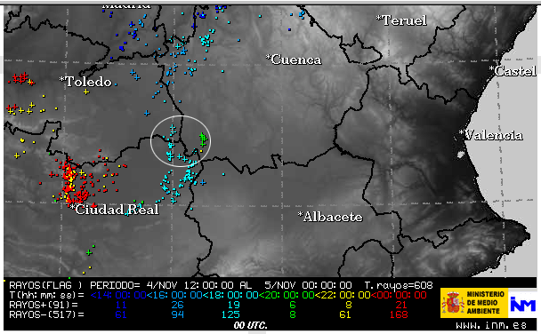 Este es el mapa de rayos del INM, donde enmarco con una circunferencia blanca la actividad tormentosa de aquella tarde-noche.