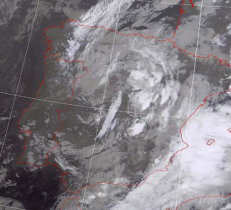 Y la imagen NOAA de las 18:03 hora local, instantes en los que me sorprendió la granizada dentro del coche. También marco con circunferencia negra el núcleo convectivo originario de tal actividad tormentosa.