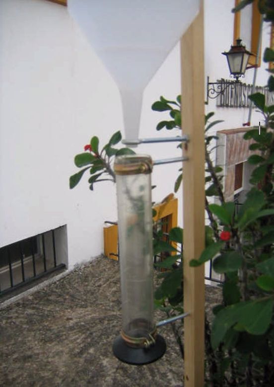 El pluviómetro tiene un embudo de 15 cm de diámetro y una probeta, de 4 cm de diámetro y de plástico, fija mediante abrazaderas a otro palo de madera. Los palos de madera tienen una altura de 1m 15cm.