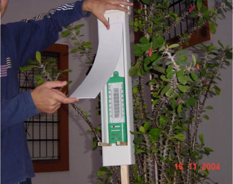 1º) Fabricar la garita y el pluviómetro(se forman para ello dos grupos de 8 alumnos cada uno).Utilizamos las indicaciones generales dadas en las actividades del concurso con algunas variantes en los materiales: para protección del termómetro hemos utilizado un cajetín de plástico, de 65X12X6 cm al que hemos fijado el mismo, con un tornillo y tuercas que lo mantengan separado de la pared de este cajetín. Posteriormente lo hemos sujetado a un palo de madera .(Ver fotografías).