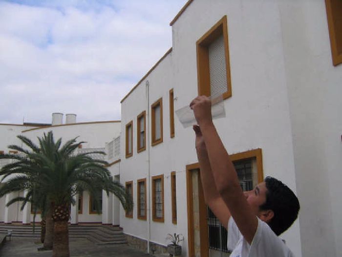 - Decidir entre todos el emplazamiento de la Estación Meteorológica. Valorando ventajas e inconvenientes, decidimos ubicarla a la entrada del colegio en una pequeña terraza, sobre un garaje, que está a 2m 68 cm del suelo y donde podemos utilizar un macetón (58 cm de alto) para sujetar ambos aparatos de medida. Además, esta zona pasa desapercibida en las entradas y salidas del colegio y por tanto está alejada de “miradas curiosas “( el centro tiene muchos alumnos...).