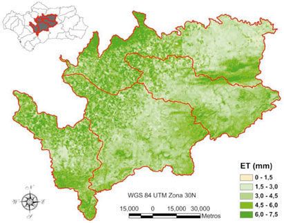 El modelo METRIC fue aplicado al Valle del Guadalquivir con imágenes procedentes del satélite Landsat 5 TM. Las imágenes obtenidas tienen una resolución espacial de 30 m para la información similar a la que percibe el ojo humano, y 120 m para la información de temperatura de la superficie terrestre, permitiendo la realización de análisis a diferentes escalas; desde parcela hasta cuenca. El estudio se ha centrado en diferentes subcuencas del Río Guadalquivir (Guadajoz, Bajo Genil, Corbones y Guadalquivir del Guadalbullón al Guadajoz; Figura 4), situadas en Andalucía, sur de España. La Figura 4 muestra la localización de dichas subcuencas y un mapa de evapotranspiración real (ETc) diaria de las mismas obtenido con el modelo METRIC para un día de primavera del año 2007.