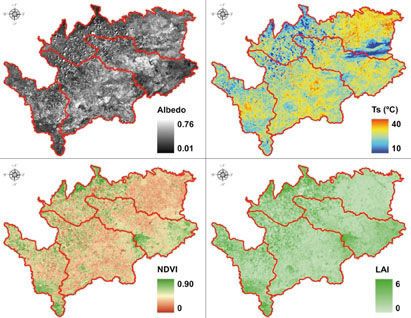 La aplicación de técnicas de teledetección y el modelo METRIC también proporcionó otras variables de gran utilidad a la hora de la caracterización de la superficie terrestre. Así, información relativa a albedo#18, índices de vegetación#19 (como NDVI o LAI), o temperatura de la superficie también fue determinada para las subcuencas consideradas anteriormente (Figura 5).