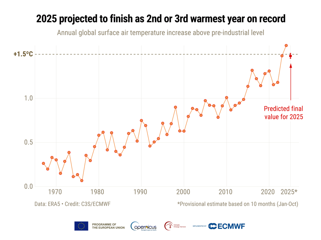 Es prácticamente seguro que 2025 terminará siendo el segundo o tercer año más cálido jamás registrado, posiblemente empatado con 2023, el segundo año más cálido actual, y detrás de 2024, el año más cálido jamás registrado.