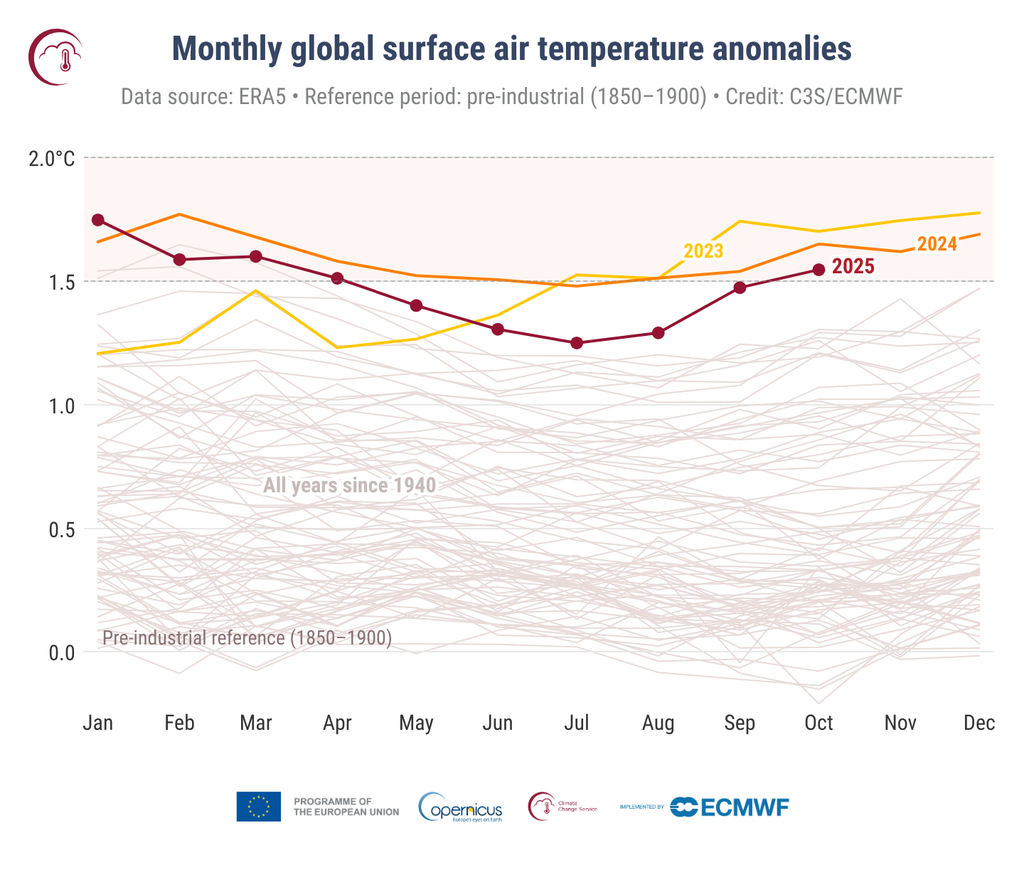 Octubre de 2025 fue 1,55 °C superior al promedio estimado de 1850-1900 utilizado para definir el nivel preindustrial, el primer mes por encima de 1,50 °C desde abril de 2025.