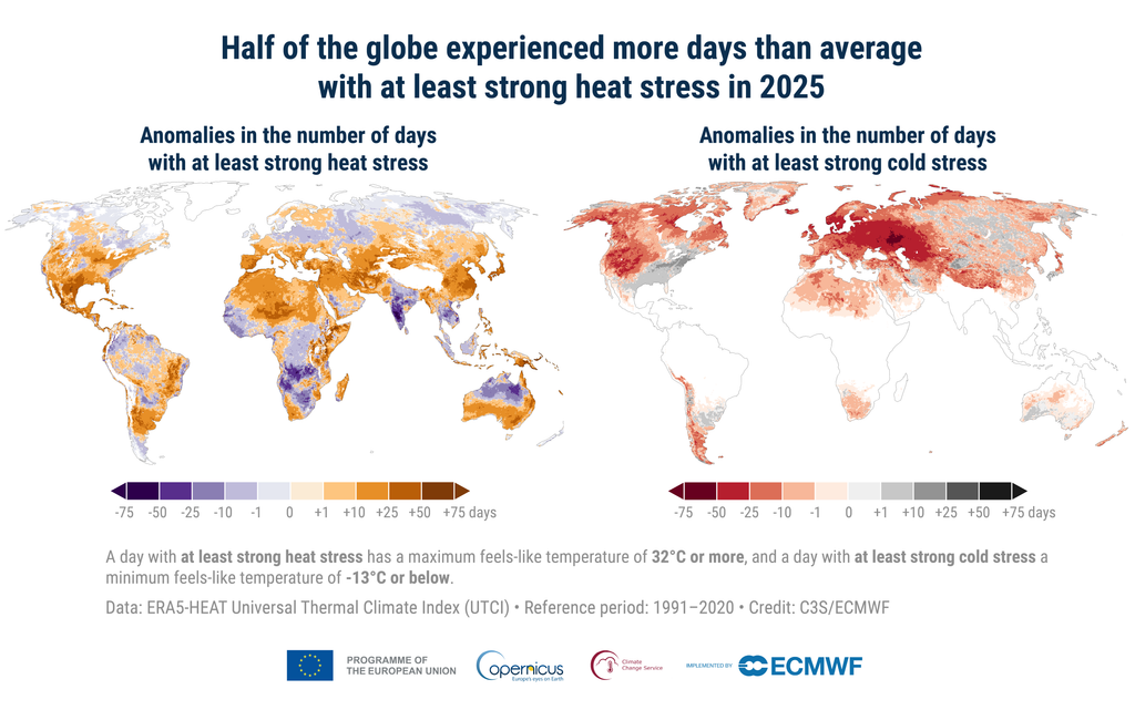 [1] Salvo que se indique lo contrario, todos los resultados se basan en el conjunto de datos de reanálisis climático global ERA5 elaborado por el Centro Europeo de Previsiones Meteorológicas a Plazo Medio (CEPMPM) y que abarca el periodo comprendido entre enero de 1940 y la actualidad. Otros conjuntos de datos distintos del ERA5 pueden clasificar 2025 como el segundo año más cálido debido a la diferencia relativamente pequeña entre 2023 y 2025.