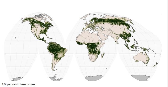El mapa de arriba considera un área cubierta de bosques si el 30 por ciento de la tierra está cubierto de árboles; el segundo mapa define a un "bosque" cuando hay un 10 por ciento de la cubierta de árboles. La diferencia en los cálculos de los bosques se deriva principalmente de las áreas de la cobertura de árboles intermedios, tales como sabanas, matorrales, bosques de dorsales de montaña, y la taiga boreal.