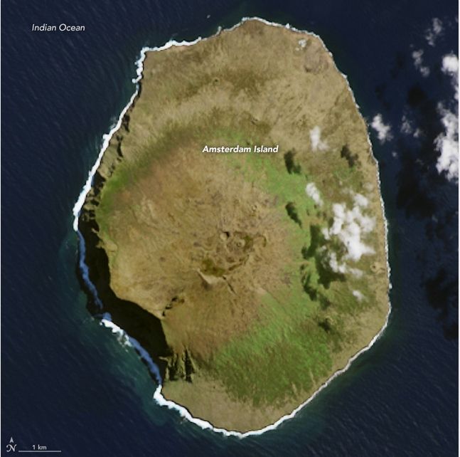 El sensor OLI de Landsat 8 adquirió esta vista de cerca de la isla de Ámsterdam el 26 de marzo de 2015. Esta cumbre volcánica se encuentra cerca de la dorsal oceánica india del este, y es el volcán más al norte por encima de la línea de aguas en la placa antártica. El punto más alto de la isla se encuentra a 867 metros (2.844 pies) sobre el nivel del mar. Hay dos calderas dentro de un área de sólo 70 kilómetros cuadrados.