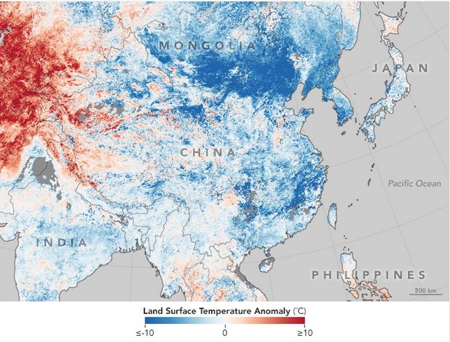 Más al norte, Mongolia y Mongolia Interior también vieron temperaturas anormalmente bajas en enero. En Eergu'Na, Mongolia Interior, las temperaturas alcanzaron un nivel record de - 47 °C (-53 °F). El clima frío en Mongolia, sin embargo, va más allá del intervalo de tiempo representado en este mapa. Temperaturas extremadamente bajas y nevadas, un intenso fenómeno invernal llamado localmente dzud, han ha persistido desde noviembre de 2015 y se espera que afecten a casi 1 millón de personas, según Reliefweb. Los animales son vulnerables, así; Mongolia perdió alrededor del 20 por ciento de su ganado durante el dzud de 2009-2010.