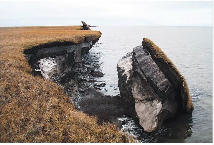 La fotografía de arriba, del U.S. Geological Survey’s Alaska Science Center, muestra permafrost colapsado a lo largo de la costa de Alaska. Cuando el permafrost se pone bastante caliente, el suelo se descongela y se incrementa la actividad microbiana. La descongelación también abre nuevas vías para que los almacenes más antiguos de metano "geológico", atrapados a largo por glaciares y capas de suelo, presenten fugas. Ambos procesos liberan gases de efecto invernadero, incluyendo el metano y el dióxido de carbono, a la atmósfera.