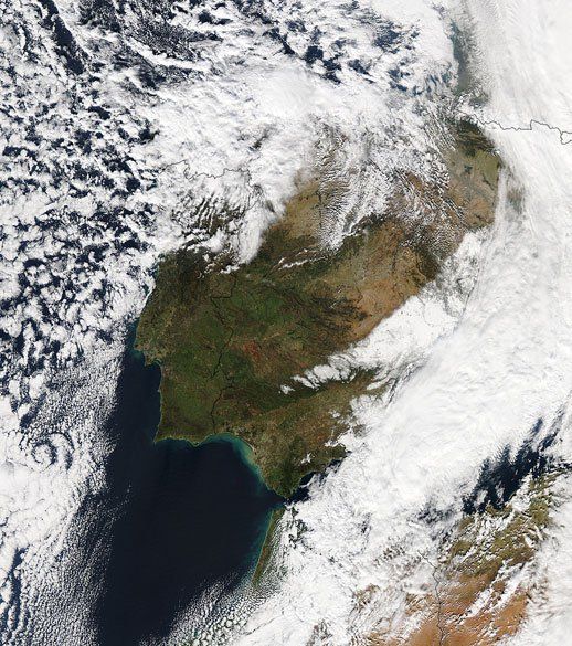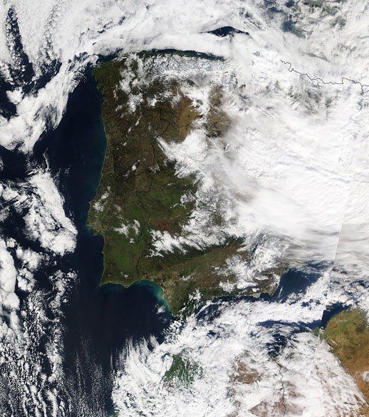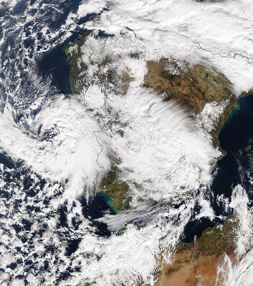 En la imagen de alta resolución del satélite TERRA con su sensor MODIS se aprecia un segundo vórtice depresionario, constitutivo de la borrasca principal en superficie, y con cierta dificultad, numerosas y extensas superficies cubiertas de nieve en Andalucía oriental, destacando Sierra Nevada, Sierra de Lújar, y todas las sierras litorales de Granada, Almería y Málaga. Mucho más fácil de observar es la superficie nevada del SE aragonés, S de Cataluña, zona interior de la Comunidad Valenciana, y todo el tercio norte peninsular incluyendo Galicia y el NE de Castilla y León (ver figura 22).
