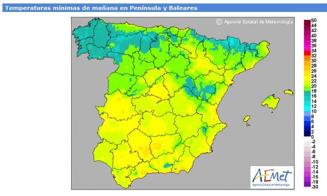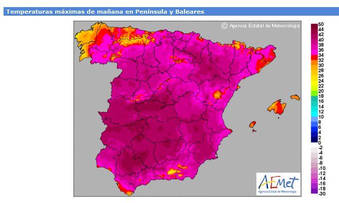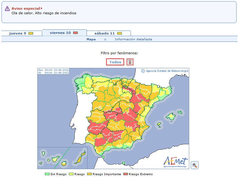 Toda España está siendo sometida a una ola de calor veraniega que de forma progresiva se ha ido instalando sobre ella a lo largo de los días anteriores. El punto más álgido será el día 10 de agosto cuando AEMET alerta a gran parte de España con valores muy altos de temperaturas máximas y mínimas.