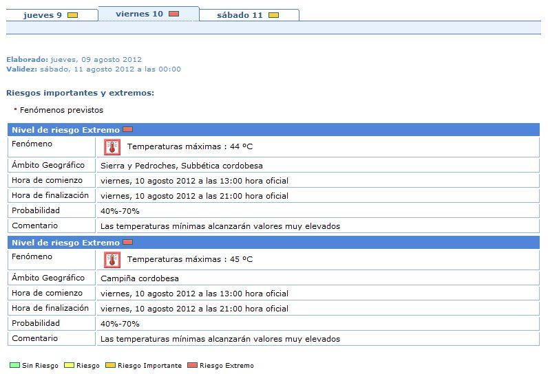 Se muestran algunos mapas significativos de esta ola de calor empezando por las alertas del día 10 y los valores previstos en las zonas de Córdoba.