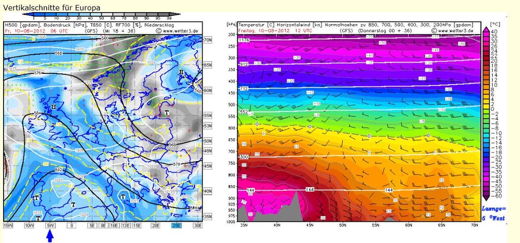 Corte vertical sur-norte de temperatura y viento para el 10 de agosto a las 12 UTC, imagen de la derecha, desde 5 oeste, flecha azul en el mapa de la izquierda.La Península se ve en el gráfico de la derecha como un promontorio gris sobrevolado por temepraturas muy cálidas a las 12 UTC del día 10 de agosto, según lo previsto por el modelo GFS.