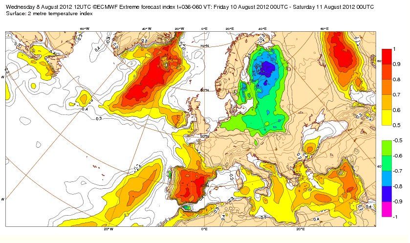 Índice de rareza de la temperatura a dos metros, EFI-T2m, para el día 10 de agosto completo. Nótese la singularidad de la Península con valores altos del índice (máximo hasta 1 para temperaturas altas según la climatología del modelo) frente a los valores de no rareza de la zona del norte de África.