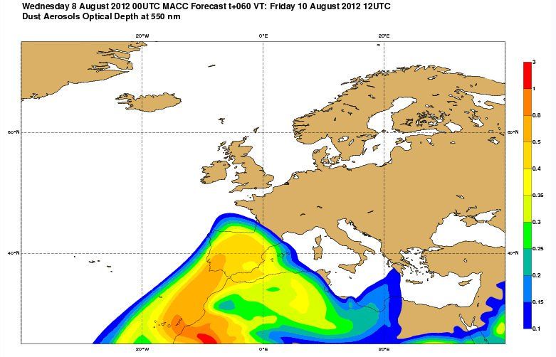 Índice de aerosoles de polvo relacionado con la presencia de partículas en suspensión que impiden la llagada de luz visible al suelo, según MACC-ECMWF. La calima se hará presente en Canarias.