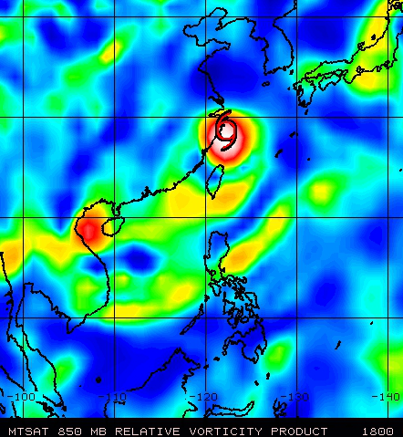 La imagen superior muestra la localización de Haikui al tocar tierra a partir de producto de vorticidad relativa a 850 mb. Máximos de vorticidad relativa están asociados a sistemas ciclónicos con intensos vientos al nivel dado.