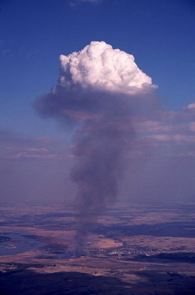 ”No sé si será la respuesta correcta, ...pero pienso que el humo que forma el pirocúmulo es mucho más oscuro al estar compuesto de cenizas (aparte de otros elementos también). Sin embargo, los cúmulos que se observan a la derecha de la foto no son tan oscuros porque tienen mucha más cantidad de vapor de agua”.