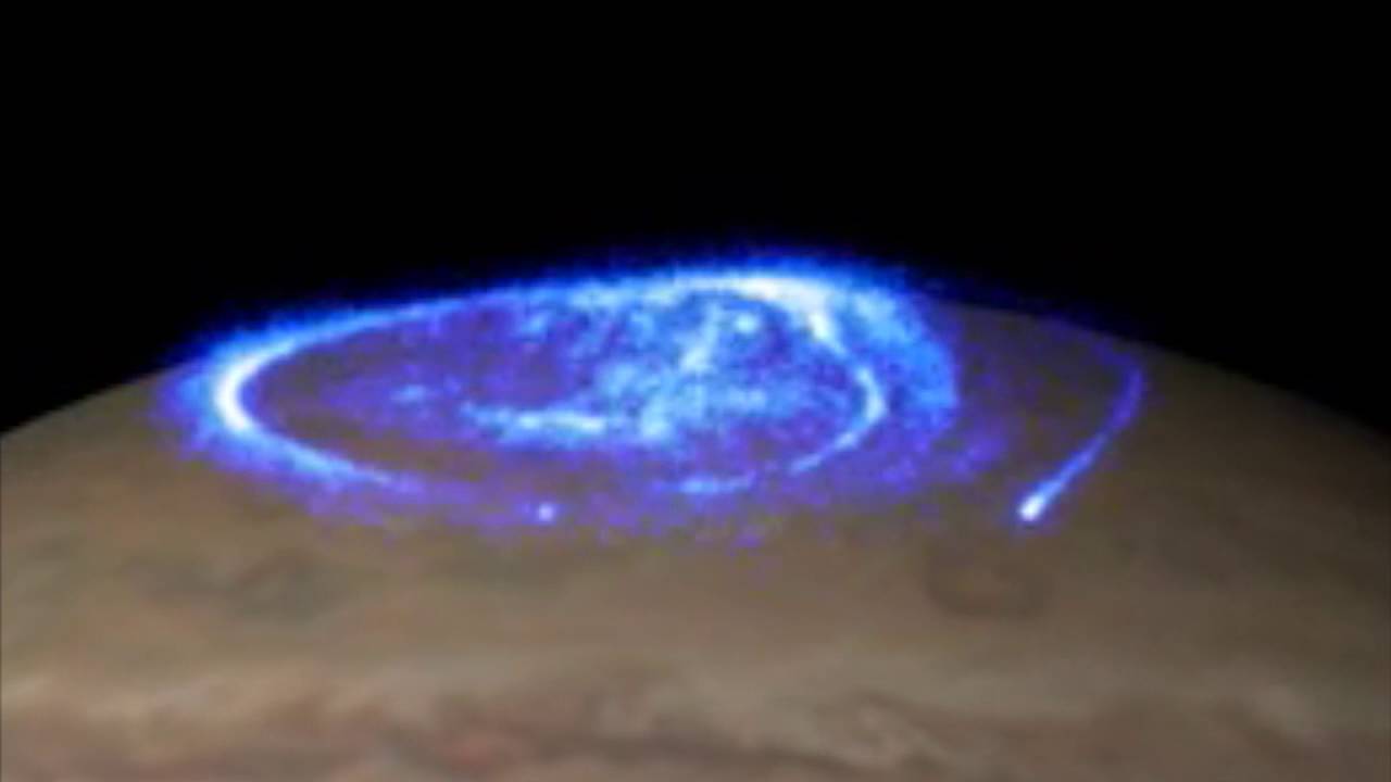 Como en la Tierra, las auroras se producen por la interacción del campo magnético de un planeta con su ambiente. Las auroras de Júpiter observadas por el telescopio espacial Hubble de la NASA son algunas de los más activas y más brillantes jamás capturadas por Hubble, alcanzando intensidades de más de mil veces más brillantes que las que se observan en la Tierra. La sensibilidad del Hubble a la luz ultravioleta captura el brillo de las auroras por encima de la parte superior de las nubes de Júpiter.