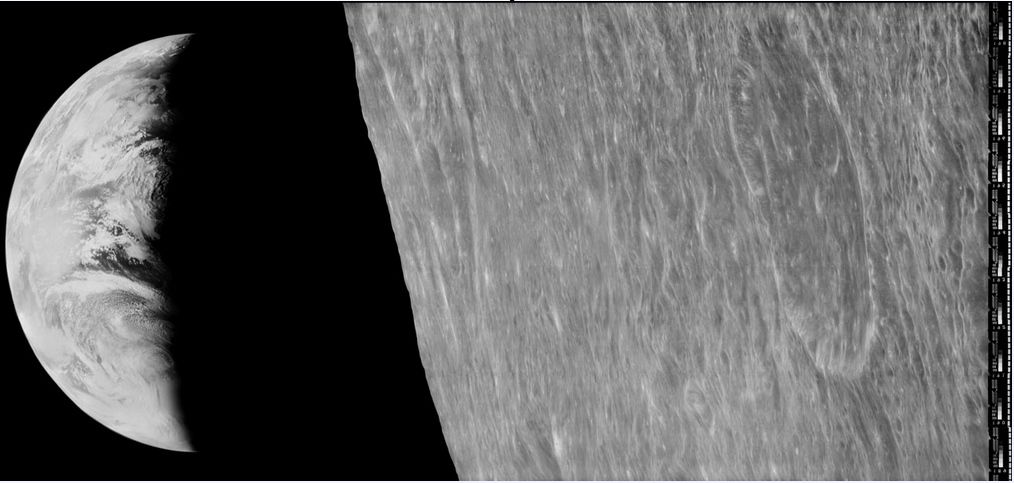 Colgada casi estacionaria en el cielo cuando se ve desde la superficie lunar, la Tierra parece ser la creación más allá del horizonte lunar accidentado desde el punto de vista de la nave espacial en órbita. Dos años más tarde, la tripulación del Apolo 8 registraría una de las escenas más famosas de color: salida de la Tierra desde la órbita lunar