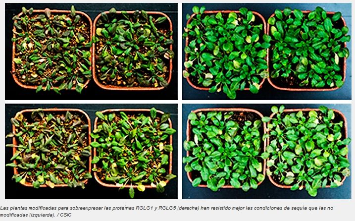 Las plantas modificadas para sobreexpresar las proteínas RGLG1 y RGLG5 (derecha) han resistido mejor las condiciones de sequía que las no modificadas (izquierda). /CSIC