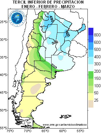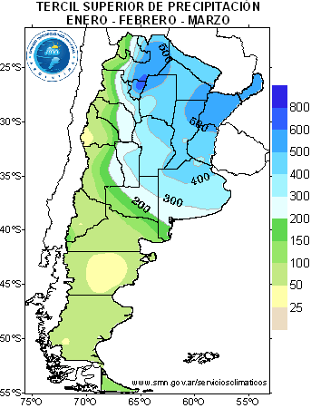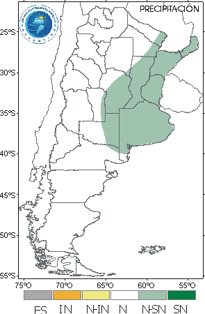 PRECIPITACIÓN: Para este trimestre se espera que la precipitación sea normal o superior a la normal en la región del Litoral,provincia de Santa Fe, gran parte de Córdoba, este de La Pampa y provincia de Buenos Aires. En el resto del país se esperan condiciones próximas a la normalidad dentro del trimestre.