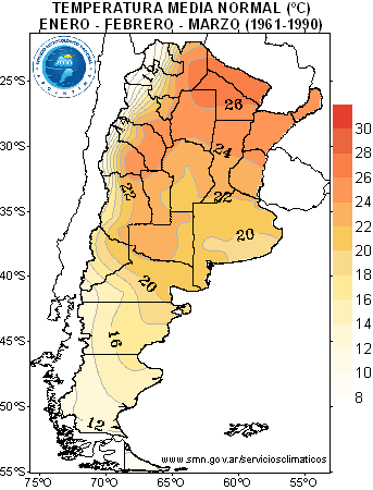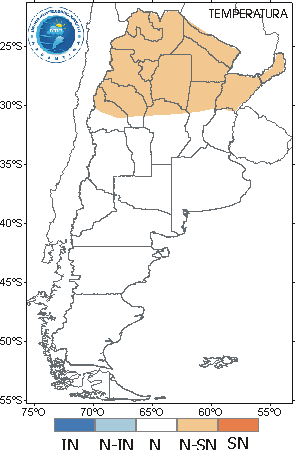 TEMPERATURA: Para este trimestre se espera que la temperatura media sea normal o superior a la normal en el norte del país, particularmente al norte de 30ºS. En el resto del territorio la temperatura media, en el promedio de estos 3 meses, estaría dentro del rango de normalidad.