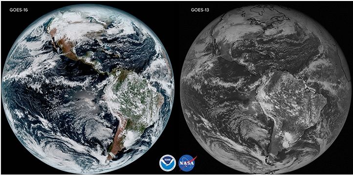 La imagen en la parte superior muestra el disco completo del Hemisferio Occidental según lo observado por GOES-16 a la 1:07 pm hora del Este del 15 de enero. La segunda imagen (abajo) muestra la nueva imagen junto a la tomada por GOES-13 en el mismo momento. Observe que las características de nubes y continentales están ligeramente compensadas debido a las diferentes posiciones de los satélites: GOES-16 se encuentra a 89.5º longitud Oeste, mientras que GOES-13 observa desde 75 º Oeste.