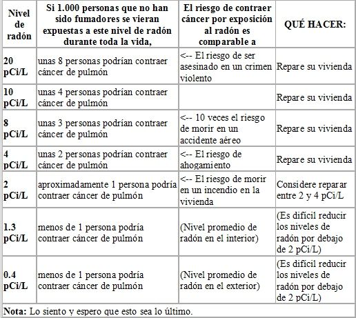 Desafortunadamente, muchas personas en EE.UU. llegan a la conjetura de que ya que el nivel recomendado para tomar medidas es de 4 pCi/L cualquier nivel de radón por debajo de esta cifra es seguro. Esta percepción es muy común en el mercado de bienes raíces. Para la mayoría de los estadounidenses su mayor exposición al radón ocurre cuando están en sus hogares, especialmente cuando se encuentran en habitaciones que están en contacto con el suelo o que están ubicadas inmediatamente sobre el mismo, tales como los sótanos.