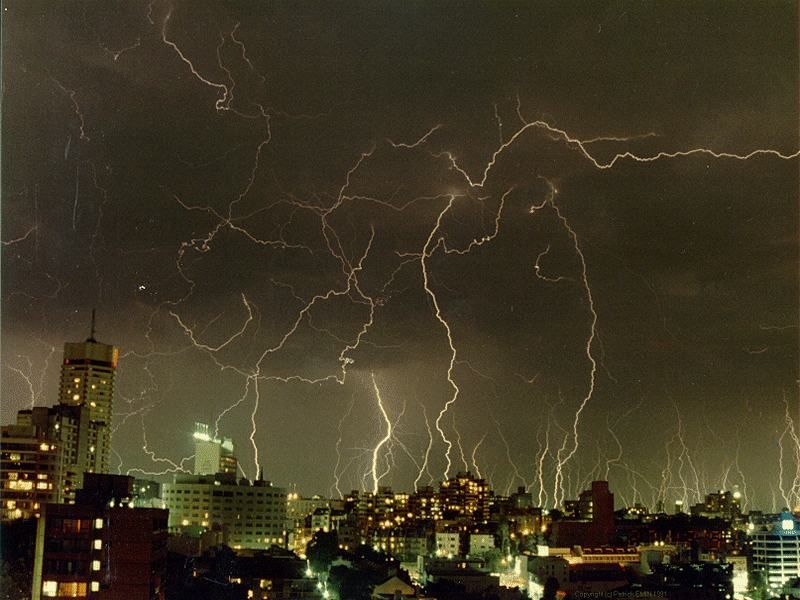 Si alguien me pudiera explicar como pueden caer al mismo tiempo ( en la misma decima e segundo) aproximadamente 40 rayos nube-tierra, como se puede apreciar en esta foto, se lo agradecería. Tiene que ser un espectáculo indescriptible y al mismo tiempo amenazador.