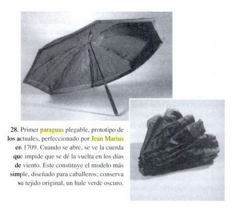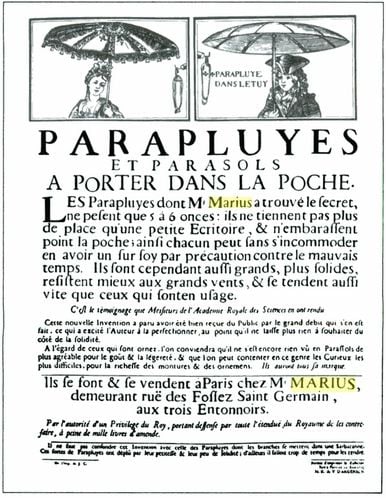 En 1705 se inventó el paraguas plegable que hoy conocemos por Jean Marius en Francia, aunque durante mucho tiempo su principal uso no fue el de protegerse de la lluvia sino que se utilizaba como signo de prestigio. Era plegable, con tela de tafetán impermeabilizada.