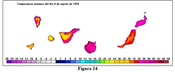 El mapa de la figura 14 representa las temperaturas máximas del día 8 de agosto de 1976, que con una ‘temperatura máxima de la ola’ de 35,3 ºC es el día más cálido, superándose los 40ºC en estaciones de las islas de Tenerife y Gran Canaria. Entre las temperaturas máximas de este día en las estaciones de la red principal de AEMET destacan los 38,2 ºC de Tenerife ‘Los Rodeos’, los 37,6 ºC de Santa Cruz de Tenerife o los 37,0 ºC de Lanzarote.