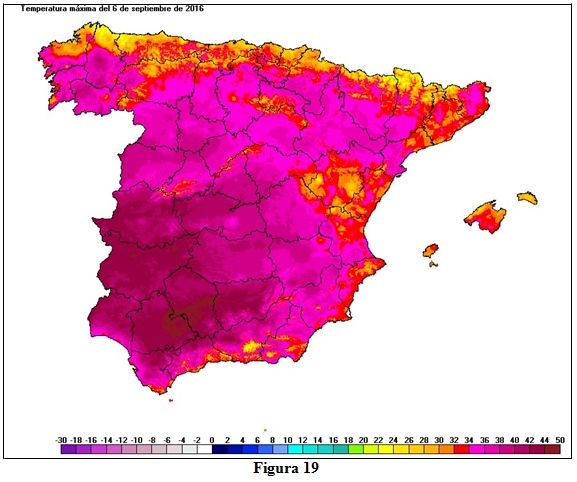 Como puede observarse en el mapa de la figura 19 en buena parte de Extremadura y Andalucía se superaron los 45 ºC, dando como resultado que fueran muchas las estaciones de la red principal que alcanzasen durante estos días su efeméride de temperatura máxima absoluta para un mes de septiembre, entre ellas cabe citar a Córdoba con 45,4 ºC el día 6, Sevilla con 44,8 ºC, Murcia y Jerez de la Frontera con 44,6 ºC, Morón de la Frontera con 44,4 ºC, todas ellas el día 5, Badajoz con 43,7 ºC el día 6, Murcia ‘Alcantarilla’ con 43,6 ºC el día 5, Granada con 43,1 ºC el día 6 y un largo etcétera. También se han establecido efemérides de temperatura mínima más alta, pero en menor número; entre las más destacables Castellón con 24,7 ºC, y Zaragoza con 24,0