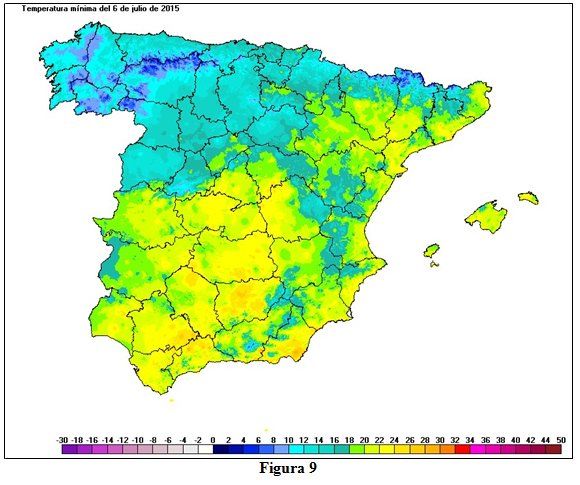También las temperaturas mínimas del 6 de julio representadas en el mapa de la figura 9 fueron muy elevadas, superándose los 20 ºC en todas las regiones, a excepción del cuadrante noroeste, e incluso los 25 ºC en zonas de Andalucía, Ciudad Real, Albacete, Murcia, Alicante, Tarragona, Barcelona, Lleida, Huesca y Baleares.