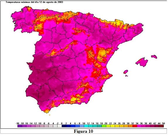 El mapa de la figura 10 muestra las temperaturas máximas correspondientes al 12 de agosto de 2003, que es el día en que se registra la ‘temperatura máxima de la ola’, con 37,2 ºC, y 34 provincias afectadas. Vemos como se superan los 40ºC en amplias zonas, especialmente de Extremadura y Andalucía. Entre las efemérides de temperatura máxima absoluta registradas estos días entre las estaciones de la red principal de AEMET tenemos Jerez de la Frontera con 45,1ºC, Badajoz/Talavera la Real con 44,8 ºC, Huelva ‘Ronda Este’ con 43,4 ºC, máximas correspondientes al 1 de agosto en los tres casos, Girona ‘Costa Brava’ con 41,2 ºC el 13 de agosto, Madrid ‘Cuatro Vientos’ con 40,6 ºC el día 1, Burgos ‘Villafría’ con 38,8 ºC el día 4 de agosto, etc.