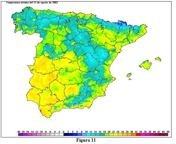También las temperaturas mínimas del 12 de agosto de 2003, que podemos ver representadas en el mapa de la figura 11, fueron muy elevadas superándose los 25ºC en Extremadura y amplias zonas de Andalucía, rozándose incluso los 30ºC en algunas estaciones. Entre las efemérides por temperatura mínima más alta en estaciones principales, tenemos los 30,0 ºC de Jaén, los 28,1ºC de Ceuta, los 27,8 ºC de Barcelona ‘Fabra’ y de Madrid ‘Cuatro Vientos’, etc.