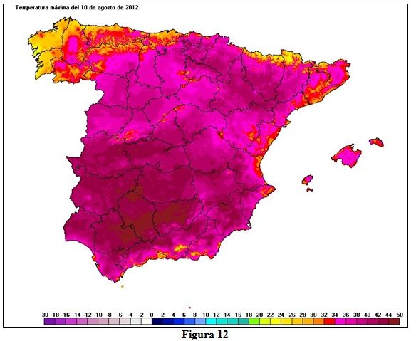 Los mapas de las figuras 12 y 13 representan las temperaturas máximas y mínimas del 10 de agosto de 2012.