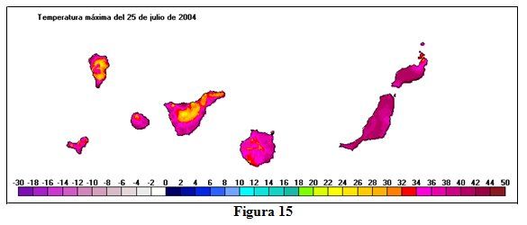 Otra 'Ola de calor' muy intensa vivida en el archipiélago Canario, fue la acontecida entre los días 23 y 29 de julio de 2004, que abarcó a las dos provincias, dándose la circunstancia de que entre los días 25 y 28 afectó a las seis estaciones utilizadas en el estudio. El día más cálido resultó el 25 de julio, al que corresponde el mapa de la figura 15, con una 'temperatura máxima de la ola' de 36,2 ºC.