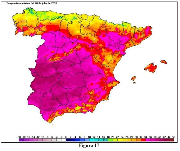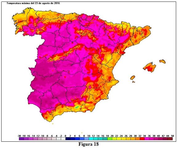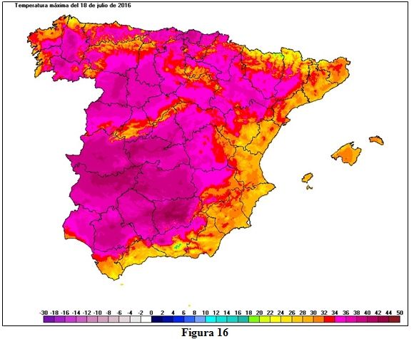 El mapa de la figura 16 muestra las temperaturas máximas del 18 de julio de 2016, en el que podemos ver que aunque las temperaturas más elevadas se dan en Extremadura y Andalucía, también en la mitad norte se alcanzan temperaturas muy altas. Entre las temperaturas máximas registradas estos días en las estaciones principales de AEMET, destacan en la mitad sur los 42,3 ºC de Morón y Sevilla, los 40,7 ºC de Almagro, los 40,4 ºC de Toledo todos ellas el día 19, los 40,2 ºC de Córdoba el día 18 y los 40 ºC de Badajoz los días 17 y 18; en la mitad norte las máximas más reseñables son los 41,7 ºC del día 18 en Ourense, los 40,4 ºC de Bilbao también el día 18, los 39,5 ºC del día 19 en Zaragoza, los 39,2 ºC de Pamplona también el 19, los 39,1 ºC del día 18 en Zamora o los 38,9 ºC del 19 en San Sebastián; también hay que citar los 37,0 ºC del día 18 en Oviedo, actual efeméride de su serie que arranca en 1972.