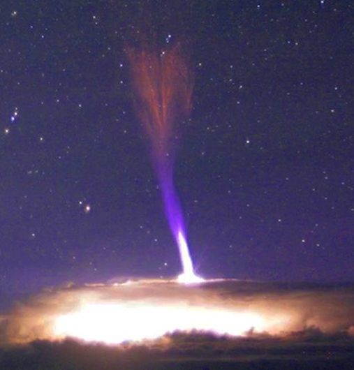 Los llamados "relámpagos espaciales" o jets gigantes y sus primos, los sprites, son verdaderos fenómenos meteorológicos espaciales. Habitan la atmósfera superior junto a auroras, meteoros y nubes noctilucentes. Algunos investigadores creen que están vinculados a los rayos cósmicos: las partículas subatómicas del espacio profundo que golpean la parte superior de la atmósfera de la Tierra producen electrones secundarios que podrían, a su vez, proporcionar la chispa para estos tornillos hacia arriba.