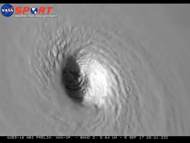 Destacado es uno de los videos más dramáticos aún tomados de un ojo y rotación de la pared del ojo. El video de tiempo fue tomado desde el espacio por el satélite GOES-16 de la NASA la semana pasada sobre uno de los ciclones tropicales más poderosos de la historia: el huracán Irma.