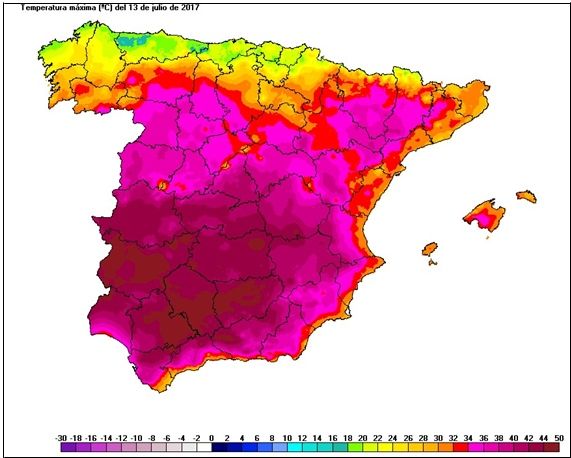 El día más cálido fue el 13, fecha a que corresponde el mapa de la figura 18, en el que podemos ver como en el centro y sur peninsular se superaron ampliamente los 40ºC, dándose los valores más altos en los valles del Guadiana y del Guadalquivir con temperaturas por encima de 45 ºC.