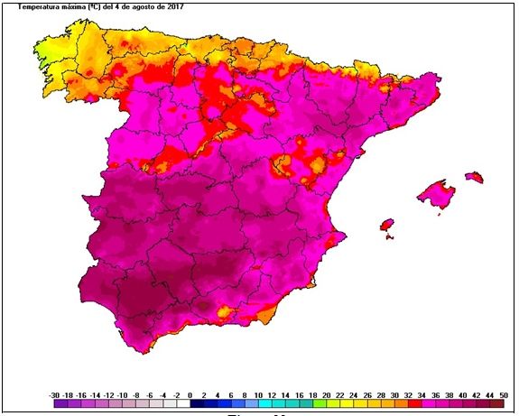 En el mapa de la figura 22 se representan las temperaturas máximas del 4 de agosto que resultó el día más cálido de esta ‘Ola de calor’ y también del verano para el conjunto de la Península, superándose ampliamente los 40 ºC en la mitad sur y zonas de Cataluña, limitándose a Galicia, Cantábrico y puntos de alta montaña las zonas en que las máximas se quedaron por debajo de los 30 ºC.
