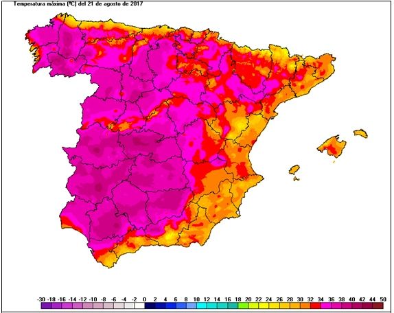 El mapa de la figura 24 muestra las temperaturas máximas del 21 de agosto, en el que podemos ver como los 40 ºC solo se superaron en observatorios de las provincias de Cáceres, Badajoz, Toledo, Ciudad Real, Sevilla, Córdoba, Lugo y Ourense, quedando por debajo de los 35ºC en las provincias mediterráneas y en el extremo norte.
