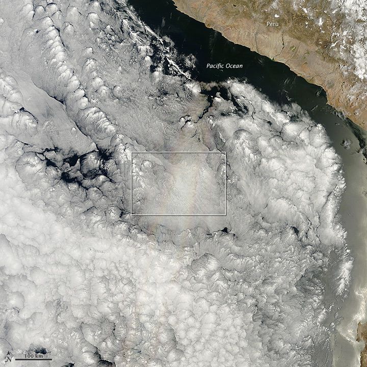 El 21 de diciembre 2013 - el solsticio de verano o invierno, dependiendo del hemisferio, el sensor MODIS en el satélite Terra de la NASA tomó esta imagen de color natural. Frente a la costa del Pacífico en Perú, un efecto óptico de arco iris conocido como "gloria", añadió un toque de color en medio de las tonalidades grises y blancas de las nubes asociadas a estratocúmulos marinos.