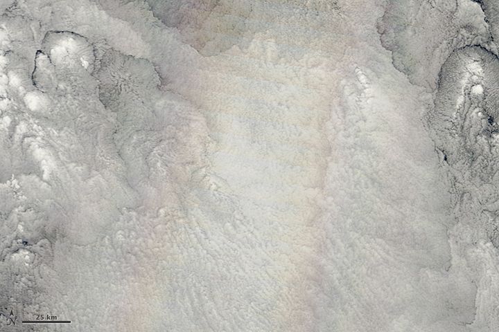 Las nubes en esta imagen "son muy buen ejemplo de estratocúmulos marinos " células cerradas ' ", escribe Joe Munchak, científico atmosférico del Centro de Vuelo Espacial Goddard de la NASA. " Estos se caracterizan por grandes regiones de débil ascensos del aire (que forman las nubes) rodeadas por zonas estrechas de aire descendente formando las líneas finas de aire claro o más delgadas nubes que rodean a las células. "