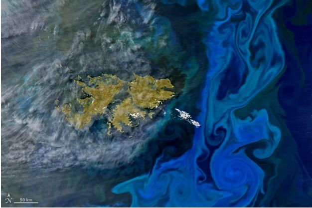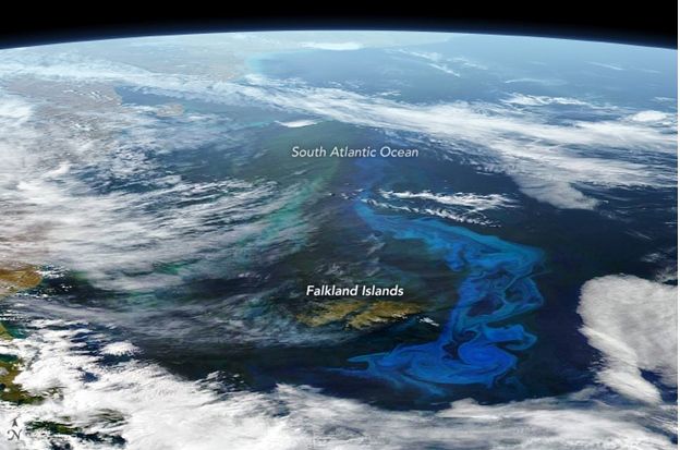 Los remolinos de azul lechoso y verde revelan la presencia de cantidades masivas de fitoplancton en el Océano Atlántico Sur cerca de las Islas Malvinas. Las floraciones densas se extendían a cientos de kilómetros. Las bocanadas de blanco en cada imagen son nubes delgadas.