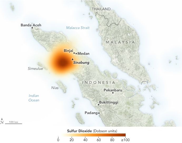 El vulcanólogo Simon Carn de Michigan Tech también notó a través de Twitter que el instrumento OMI en el satélite Aura había detectado recientemente emisiones crecientes de SO2 alrededor de Sinabung, una señal de que el magma fresco estaba acercándose a la superficie.