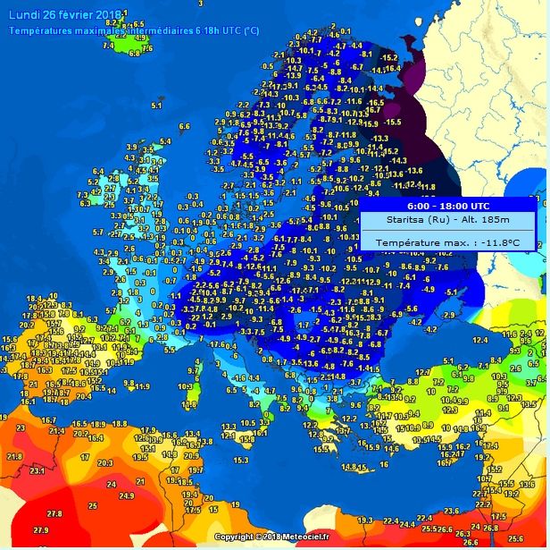El aire frío polar continental que se está extendiendo por gran parte de Europa proveniente de Siberia y Rusia (la "siberiana"), deja temperaturas heladoras en casi toda Europa con máximas que en muchos sitios no superan los 0ºC.